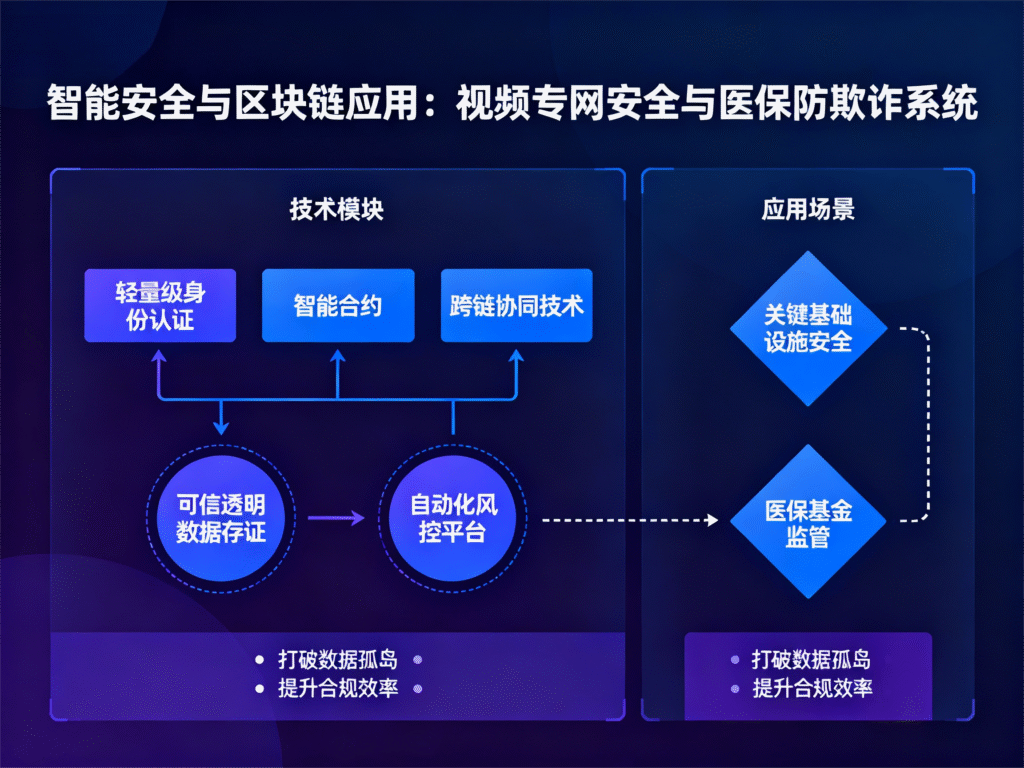视频专网安全与医保防欺诈系统:基于区块链的轻量级身份认证、智能合约与跨链协同技术,构建可信、透明的数据存证与自动化风控平台,适用于关键基础设施安全、医保基金监管等场景,打破数据孤岛,提升合规效率。