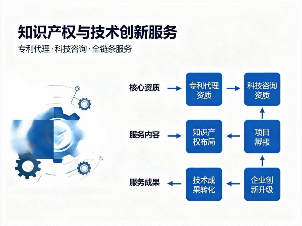 专利代理与科技咨询,为企业的技术成果转化提供知识产权布局、项目申报、创新孵化等全链条服务。